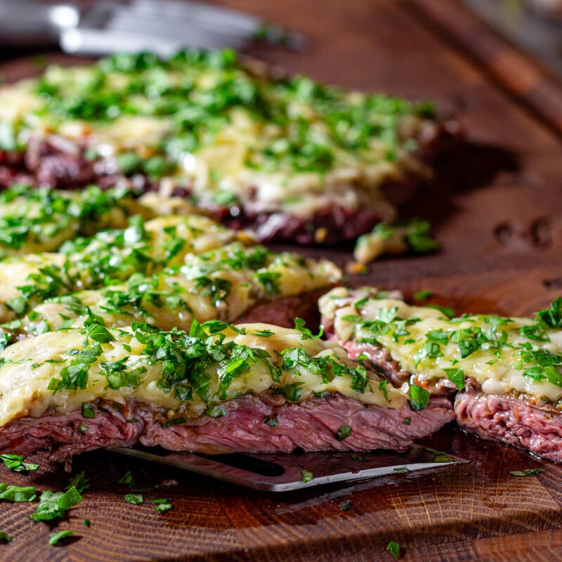 Bavette, een mooi smaakvol stuk rundvlees van zichzelf. Maak het nóg lekkerder door het te beleggen met een salsa van gegrilde groenten en kaas!